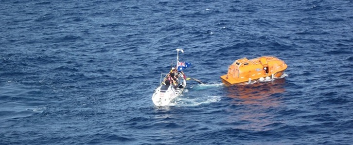 Rescue boat of "Nordic River" rescues injured crewman. Image by Kawasaki Kisen Kaisha, Ltd.