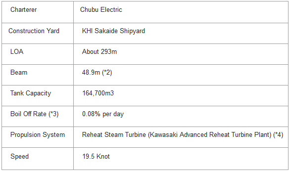 (*2) Allowable width to pass through the Panama Canal after the expansion. (*3) Boil Off Rate (BOR): Ratio of natural vaporized gas against maximum tank capacity to indicate capability of tank heat-insulation system. (*4) Reheat Turbine Plant: Next-generation LNG carrier propulsion plant of high thermal efficiency and high reliability, incorporating the most advanced materials and control technologies including improvements in steam conditions to raise the thermal efficiency. Kawasaki Kisen Kaisha, Ltd. press release |