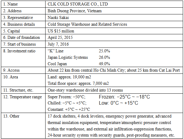 We are pleased to announce that construction of a Cold Storage Warehouse in Ho Chi Minh City, Vietnam, by CLK COLD STORAGE COMPANY LIMITED – a joint-venture established by Kawasaki Kisen Kaisha, Ltd. (“K” Line), Cool Japan Fund Inc. (“Cool Japan”) and Japan Logistic Systems Corp. (“Japan Logistic Systems”) - has been completed with Opening Ceremony held on July 21, after which operations start.