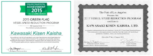 Ships participating in the program are asked to comply with speed limit of 12 knots within 40 miles (about 74 kilometers) from each port in order to reduce emissions of exhaust gases containing nitrogen oxide (NOx), sulfur oxide (SOx), particulate matter (PM) as well as CO2 from ships. As a result of this year’s achievement, “K” Line has been honored to receive this award from the Port of Long Beach for eleven consecutive years since 2005 and from the Port of Los Angeles for eight consecutive years since 2008 when their awards were commenced respectively. Especially, as to the Long Beach program, there were only two carriers including “K” Line which both recorded more than two hundred calls at the port and more than 90% compliance rate. Recognition: Long Beach Port “2015 GREEN FLAG VESSEL SPEED REDUCTION PROGRAM” (“K” Line meets 99.31 compliance rate, totaling 286 compliant legs.) Los Angeles Port “2015 VESSEL SPEED REDUCTION PROGRAM” (”K” Line meets 100% compliance rate, totaling 63 compliant legs.)
