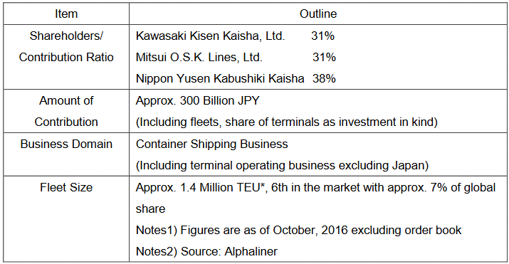 October 31st, 2016 Kawasaki Kisen Kaisha, Ltd. Eizo Murakami, President & CEO Mitsui O.S.K. Lines, Ltd. Junichiro Ikeda, President & CEO Nippon Yusen Kabushiki Kaisha Tadaaki Naito, President Kawasaki Kisen Kaisha, Ltd., Mitsui O.S.K. Lines Ltd., and Nippon Yusen Kabushiki Kaisha have agreed, after the resolution by the board of directors of each company held today, and subject to regulatory approval from the authorities, to establish a new joint-venture company to integrate the container shipping businesses (including worldwide terminal operating businesses excluding Japan) of all three companies and to sign a business integration contract and a shareholders agreement. 1. Background Although growing modestly, the container shipping industry has struggled in recent years due to a decline in the container growth rate and the rapid influx of newly built vessels. These two factors have contributed to an imbalance of supply and demand which has destabilized the industry and has created an environment that is adverse to container line profitability. In order to combat these factors, industry participants have sought to gain scale merit through mergers and acquisitions and consequently the structure of the industry is changing through consolidation. Under these circumstances, three companies have now decided to integrate their respective container shipping on an equal footing to ensure future stable, efficient and competitive business operations. The new joint-venture company is expected to create a synergy effect by utilizing the best practices of the three companies. And by taking advantage of scale merit of its vessel fleet totaling 1.4 million TEUs, realize integration effect of approximately 110 billion Japanese Yen annually and seek swiftly financial performance stabilization. By strengthening the global organization and enhancing the liner network, the new joint-venture company aims to provide higher quality and more competitive services in order to exceed our clients’ expectations. 2. Overview of the new joint-venture company