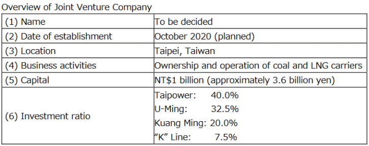 1 July 2019 Kawasaki Kisen Kaisha, Ltd.(hereinafter “K”Line),Taiwan Power Company (hereinafter Taipower), U-Ming Marine Transport Corporation (hereinafter U-Ming), and Kuang Ming Shipping Corporation (hereinafter Kuang Ming) have agreed to establish a new joint venture shipping company, and jointly signed Memorandum of Understanding (MOU) in Taipei, Taiwan on July 1. This new joint venture willownboth coal and LNG carriers, and operatethem fortransporting these raw materials to Taipower. With respect to managing and transporting coal and LNG, “K” Linehasaccumulatedanabundance of experience and specialized skills. We, therefore, will devote ourselves to contribute to the safetyof Taiwan's energy requirementsby providingour many years of accumulated know-how in ship management and safe ship operations to this new joint venture.