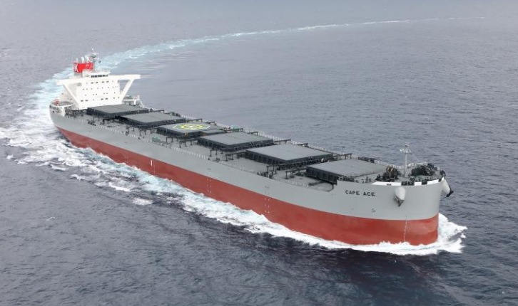 The 100,000-dwt bulk carrier ""CAPE ACE". Image by Kawasaki Kisen Kaisha, Ltd. Vessel Particulars LOA: 249.94 M Width (Moulded): 43.00 M Depth: 18.70 M Draft (Moulded): 12.90 M Deadweight: 101,314 T Gross Ton: 60,133 T Main Engine: MAN B&W 6S60ME-C8.5 Speed: 14.0 KTS Class: NK Flag: Panama Builder: Namura Shipbuilding Co., Ltd. Kawasaki Kisen Kaisha, Ltd. press release