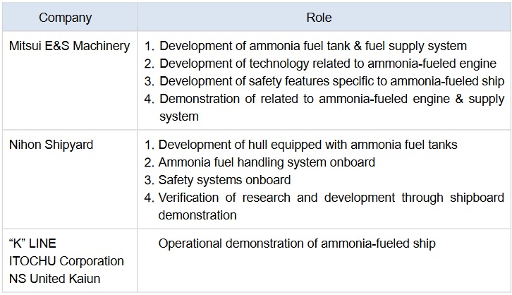 In order to achieve the International Maritime Organization's strategy to reduce greenhouse gas (GHG) emissions, this project will use ammonia as marine-fuel, which is attracting attention from various fields as a candidate for alternative fuels, to develop, own and operate propulsion systems and hulls ahead of other countries, with the aim of implementing ammonia-fueled ships in society under Japan's leadership as early as possible by 2028, so that Japan's maritime industry can maintain its long-term advantage in the field of zero-emission ships. Role of each company