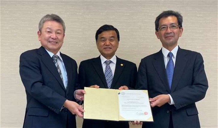 AIP granting ceremony. (From left ) Dr. Toshiyuki Shigemi, Executive Director, Senior Executive Vice President, ClassNK Mr. Yoshio Tanaka, Director, Executive Managing Officer, Shin Kurushima Dockyard Mr. Toyohisa Nakano, Executive Officer, General Manager of Ship Technical Group, "K" LINE. Image by Kawasaki Kisen Kaisha, Ltd.