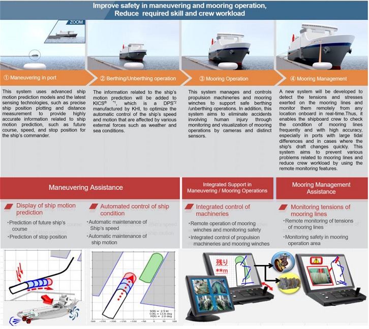The research and development aim to advance and improve safety and efficiency in berthing, Unberthing, including mooring by combining expertise from "K" LINE and "K" LINE KINKAI with advanced technologies from KHI. Currently, safe berthing/unberthing operations in ports are ensured by well experienced and knowledgeable shipboard crew about characteristics of ship specific maneuvering and mooring equipment features. For further improvement of safety, this system incorporates the latest technologies, including AI, to assist in safe berthing/unberthing operations. It will be the first system in the world that provides integrated support for all necessary operations from maneuvering in port, berthing/unberthing, mooring including mooring line monitoring. We will install the system on domestic vessels operated by "K" LINE KINKAI as a testing ground for this research and development and establish this system by spring 2025. "K" LINE group is currently working on the "K"-Assist Project ("K" LINE Autonomous Ship with Safe and Intelligent Supporting Technology), which aims to further enhance safe ship operations through the integration of expertise in safe operations and advanced technologies. "Safe Berthing/Unberthing Assist System" is one of the components of the project. "K" LINE will continue research and development to improve safety even further by providing more sophisticated support for shipboard crew and reducing their workload, as well as to realize autonomous ships in the future.