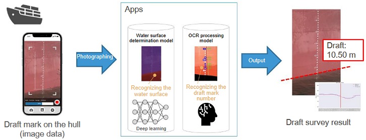 September 21, 2023 Kawasaki Kisen Kaisha, Ltd. ("K" LINE), TIS Inc. ("TIS") and Miotsukushi Analytics Inc. ("Miotsukushi") are pleased to announce that we have jointly developed a draft survey application. The application is designed to use artificial intelligence (AI) to recognize the water surface and the draft mark from the image captured with a smartphone and to display the accurate draft level with the impact of waves removed on the screen to help accurately measure the draft*1. At the end of July, the three companies jointly filed a patent application for this newly developed application. The draft is measured to calculate the weight of cargo loaded onto dry bulk carriers. Today, it is done by crew members and surveyors using the naked eye. It is possible to survey the draft with the human eye. However, it is done at the anchorage, which in some ports may be susceptible to waves. There have been cases where draft measurements even by experienced maritime professionals display a greater margin of error than expected. The jointly developed automatic draft survey application makes use of the "AI and data analysis service" offered by TIS and Miotsukushi and combines smartphones with the AI to supplement draft measurement that traditionally depended on the experience of maritime professionals with the AI. That helps equalize the degree of safety in navigation and cargo operations and maximize the cargo transportation volume. At "K" LINE, digitalization is underway as a functional strategy for realizing the business strategy in the medium-term management plan*2 announced in May 2022. With the use of data and digital technologies, "K" LINE will enhance the core values of safety, environmental conservation and quality in a bid to boost its competitiveness and corporate value. Schematic of the application