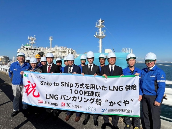 Celebrating LNG bunkering vessel "Kaguya" achieves 100th ship-to-ship LNG bunker supply. Image by K-Line.