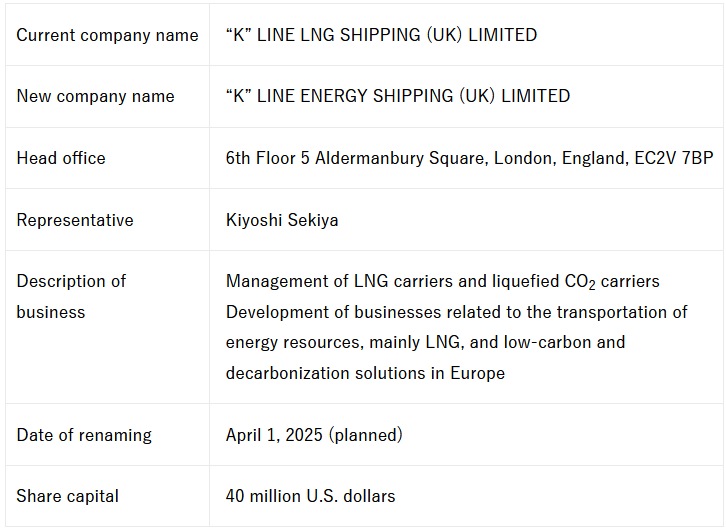 Europe is an advanced market leading low-carbon and decarbonization efforts. New solutions supporting the decarbonization of society, such as liquefied CO2 transportation solutions, are in demand. KLES has refined its integrated marketing between shore and marine/technical teams, customer-centric support of sales and ship management, an area where the company has accumulated capabilities through its LNG transportation operations. It also proposes and provides high-quality transportation services and meticulously meets society's needs regarding low-carbon and decarbonization solutions, including CCS. Outline of renaming