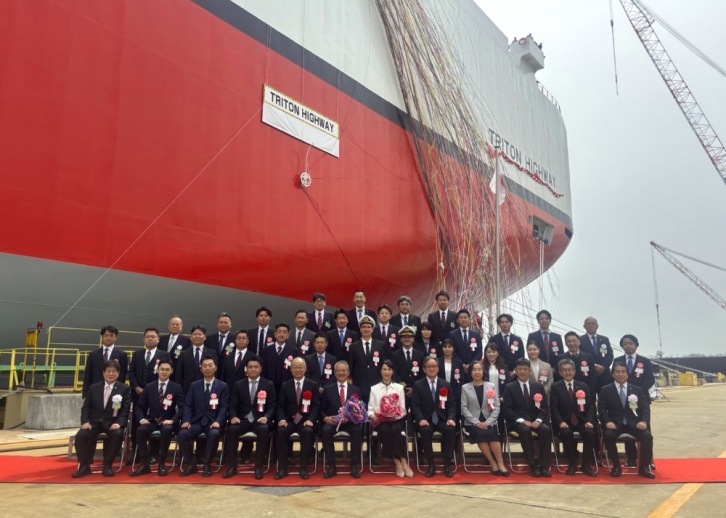 A naming ceremony was held, and the vessel was named TRITON HIGHWAY (the "Vessel") by Mr. Kazunari Kumakura, Chief Officer of the Purchasing Group, Toyota Motor Corporation (Toyota). LNG fuel is expected to reduce emissions of carbon dioxide (CO2), a greenhouse gas (GHG), by 25% to 30% and emissions of sulfur oxides (SOx), which cause air pollution, by almost 100%. This is also a next-generation environment-friendly vessel that is expected to cut emissions of nitrogen oxides (NOx) by 80% to 90% by using EGR (exhaust gas recirculation) in addition to LNG fuel. It is equipped with the dual-fuel electronic control engine "6S60ME-C10.5-GI-EGRBP" by MAN Energy Solutions. Also, with regard to fire safety measures that "K" LINE has been working on for some time, this is the first of its new car carriers to acquire the ClassNK notations (Fire Fighting) (Electric Vehicle). Including this Vessel, five car carriers operated by "K" LINE have acquired notations. In "K" LINE Environmental Vision 2050 -Blue Seas for the Future-*1, it has set the 2030 interim target of improving CO2 emissions efficiency by 50% compared with 2008, surpassing the IMO target of a 40% improvement. Furthermore, it sets its new target for 2050 as "The Challenge of Achieving Net-Zero GHG Emissions." As an action plan, it will continue to work on the introduction of new fuels which have a low environmental impact and take on the challenge of achieving the targets it has established. Vessel Particulars Main Measure: LOA 199.90 meters x Beam 38.00 meters x Depth 38.76 meters x Draft 9.30 meters Gross Ton: 77,509 Main Engine: 6S60ME-C10.5-GI-EGRBP Speed: 18.25 KTS Class: ClassNK Flag: Japan Builder: Marugame Headquarters, Imabari Shipbuilding *1. "K" LINE Environmental Vision 2050: Blue Seas for the Future As part of our action plan to reduce GHG, it is engaged in a number of initiatives, for instance introducing zero-emission fuels such as ammonia and hydrogen fuels, and carbon-neutral fuels such as bio-LNG and synthetic fuels. www.kline.co.jp/en/sustainability/environment/management.html