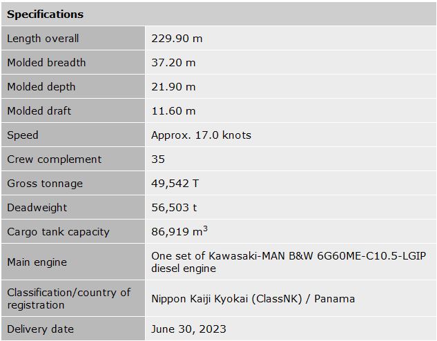 Tokyo - June 30, 2023 Kawasaki Heavy Industries, Ltd. announced today its delivery of the "AXIS RIVER" (Kawasaki hull no. 1756), an 86,700 m3 liquefied petroleum gas (LPG) and ammonia (NH3) carrier powered by LPG. The "AXIS RIVER" is the first of Kawasaki's newest-design 86,700 m3 capacity, LPG-fueled LPG/NH3 carrier, with the increased cargo capacity from the existing 84,000m3 LPG Carrier as well as ammonia loading capability. As for LPG-powered vessels, Kawasaki has completed eight vessels to date, and the "AXIS RIVER" is its seventy-first LPG carrier in total. This latest LPG/NH3 carrier has a capability of simultaneous transportation of LPG, which is already widely used as a low-carbon-emission energy source, and ammonia, which may be expected to be utilized as a new fuel in the low- and zero-carbon-emission societies. Furthermore, this vessel is designed to increase cargo tank capacity, with keeping its principal dimensions like LOA and beam similar to conventional-type vessels so that the carrier can be berthed at major LPG terminals around the world. In consideration of the strengthening of environmental regulations around the world and action plans for the Sustainable Development Goals (SDGs), Kawasaki will continue to develop and provide customers with environmental-friendly ship technologies with a focus on LPG carriers and LPG/NH3 carriers powered by LPG, as well as other types merchant vessels in comply with the latest environmental regulations, - including liquefied hydrogen carriers, the cargo of which is expected to be a fuel that is gaining popularity as a next-generation energy source. In this way, Kawasaki will contribute toward the realization of low- and zero-carbon-emission societies.