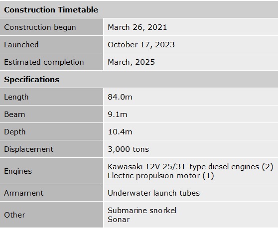 Image by Kawasaki Heavy Industries, Ltd. The submarine's construction timetable and specifications are as follows: