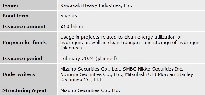 Tokyo, January 16, 2024 Kawasaki Heavy Industries, Ltd. announced today its first transition bond issuance as a means of financing via the Master Framework,* which the company established in November 2023 as the first fund-raising framework of its kind worldwide. Transition bonds are bonds issued for the purpose of financing projects based on a long-term transition strategy aimed at reducing corporate greenhouse gas emissions. Funds raised through public offerings of these bonds domestically within Japan will be used for projects related to the clean transport and storage of hydrogen and clean energy utilization of hydrogen. Specific solutions include liquefied hydrogen carriers, liquefied hydrogen storage tanks, and hydrogen gas turbines for power generation. Through the provision of such decarbonization solutions, Kawasaki will promote the transition to carbon neutrality not only within its own organization, but among its customers as well, thus contributing to the early realization of worldwide carbon neutrality. The company's bond issuance has been selected for support under the Ministry of Economy, Trade and Industry's FY2023 Subsidy for Global Warming Countermeasures Promotion Project. Bond Issuance Overview