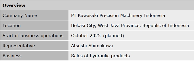 Tokyo, April 3, 2025 Kawasaki Heavy Industries, Ltd. announced today the establishment of its local subsidiary, "PT Kawasaki Precision Machinery Indonesia (KPM Indonesia)," to sell hydraulic products in Indonesia. Indonesia is a market with high growth potential, experiencing rapid economic development due to expanding infrastructure investment and active mining development backed by an abundant workforce. Against the backdrop of such rapid economic development, Kawasaki will establish a new local sales company with inventory functions in Indonesia, where demand for hydraulic equipment is increasing. This will enable us to flexibly respond to market changes and diverse customer needs. Through the establishment of this new sales company in Indonesia, Kawasaki aims to improve customer satisfaction and brand strength in the Southeast Asian market.