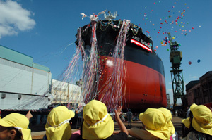 This vessel (Kawasaki hull no. 1719) is the second of a new energy-saving type bulk carrier with a capacity of 55,000 DWT developed by Kawasaki. After it is outfitted at the Kobe Works quay, the carrier will be delivered in January 2015. Features: 1. The vessel has a flush deck with forecastle and five holds that are designed for optimum transport of grains, coals, ores and steel products. Four 30-ton deck cranes are installed along the center in between hatch covers to enable cargo loading and unloading in ports that lack cargo handling facilities. 2. The vessel employs the latest in technology to achieve maximum fuel economy, including a newly developed ME-B energy-saving main diesel engine featuring electronic fuel injection, highly efficient propellers, as well as the Kawasaki semi-duct system with contra fins (SDS-F) and rudder bulb with fins (RBS-F), which all contribute to the vessel's enhanced propulsion performance. 3. The main engine and generator engine comply with Tier II NOx emission standards set by the International Convention for the Prevention of Pollution from Ships. Kawasaki Heavy Industries Ltd. press release |