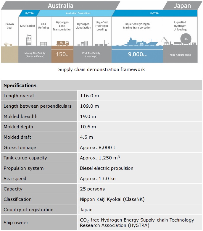 Video by Kawasaki Heavy Industries Ltd. * 1 Planned implementation as part of NEDO's Demonstration Project for Establishment of Mass Hydrogen Marine Transportation Supply Chain Derived from Unused Brown Coal. * 2 Established primarily to achieve technologies and carry out demonstration of everything from production of hydrogen via effective use of brown coal through to transportation and storage of said hydrogen, aimed at the cultivation of a CO2-free hydrogen supply chain and its commercialization. Marubeni Corporation joined HySTRA as a new member in 2018, and JXTG Nippon Oil & Energy Corporation in August 2019. * 3 New Energy and Industrial Technology Development Organization. * 4 Sumitomo Corporation joined as a new member in October 2019. Kawasaki Heavy Industries Ltd. press release