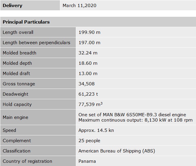 Tokyo - March 11, 2020 Kawasaki Heavy Industries, Ltd. announced today that it delivered the bulk carrier MARKET COOPER, with a capacity of 61,000 DWT (Kawasaki hull No. 8043, NACKS hull No. NE293), at the Nantong COSCO KHI Ship Engineering Co., Ltd. (NACKS), which is located in Nantong City, China and operated jointly with China COSCO Shipping Corporation Limited (China COSCO Shipping). Delivery, principal particulars, and features of the vessel are as described below.