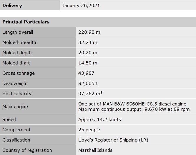 Tokyo - January 26, 2021 Kawasaki Heavy Industries, Ltd. announced today that it delivered the bulk carrier IZUMI, with a capacity of 81,000 DWT (Kawasaki hull No. 8058, NACKS hull No. NE321), for WEALTH LINE INC.at Nantong COSCO KHI Ship Engineering Co., Ltd. (NACKS), which is located in Nantong City, China and operated jointly with China COSCO Shipping Corporation Limited (China COSCO Shipping). Delivery, principal particulars, and features of the vessel are as described below. Delivery, principal particulars, and features of the vessel are as described below.
