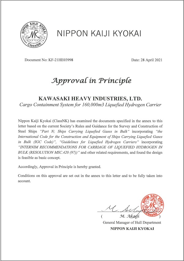 Large liquefied hydrogen carrier (cargo carrying capacity: image of 40,000 m3 × 4 tanks). Image by Kawasaki Heavy Industries Ltd. *1 Constructed by Kawasaki as a member of the CO2-free Hydrogen Energy Supply-chain Technology Research Association (HySTRA; website: http://www.hystra.or.jp/en/ ), as part of the Demonstration Project for Establishment of Mass Hydrogen Marine Transportation Supply Chain Derived from Unused Brown Coal by the New Energy and Industrial Technology Development Organization (NEDO). *2 International Code for the Construction and Equipment of Ships Carrying Liquefied Gases in Bulk. A set of international regulations governing the constructions and equipment of such ships. All ships that carry liquefied gases and that were built in or after 1986 are forced to adhere to the code, and ClassNK incorporates the code as part of its Rules and Guidance for the Survey and Construction of Steel Ships. *3 Provisional recommendations adopted by the IMO for bulk transport of liquefied hydrogen. *4 Method of assessing risk, which is determined by experts based on the frequency with which potential hazards in a system arise, and aimed at identifying ways to minimize that frequency. *5 NEDO Technology Development Project for Building a Hydrogen-based Society / Technology Development Project for Large-Scale Utilization of Hydrogen / Project for Enlargement of Liquefied Hydrogen Cargo Tank Facilities and Development of Unloading Terminal Equipment. Kawasaki Heavy Industries Ltd. press release