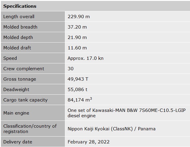 Tokyo - February 28, 2022 Kawasaki Heavy Industries, Ltd. announced today it has delivered the 84,000 m3 capacity liquefied petroleum gas (LPG) carrier CALLUNA GAS (Kawasaki hull No. 1751) for IINO KAIUN KAISHA, LTD. This is the 66th LPG carrier built by the company. This vessel is a dual-fuel LPG carrier using LPG and low-sulfur fuel oil, and their third 84,000 m3 LPG carrier adopting a dual-fuel main engine. In recent years, in order to effectively reduce emissions of greenhouse gases from international shipping, more vessels are adopting liquefied gases as an alternative to heavy fuel oil on a global scale. This very large LPG carrier is powered by LPG, which reduces greenhouse gas emissions and is expected to significantly reduce environmental impact. It is the fruit of the Kawasaki Group's accumulated knowledge in building LPG and liquefied natural gas (LNG) carriers, and LNG-fueled vessels. Kawasaki plans to develop and build more LPG-fueled LPG carriers and other commercial vessels that meet environmental standards, as well as to develop and offer other eco-friendly marine technologies, to contribute to the establishment of a low-carbon/decarbonized society. These products include vessels for transporting liquefied hydrogen, considered to be the next-generation energy source.