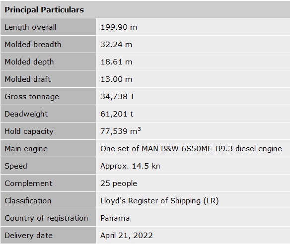 Tokyo - April 21, 2022 Kawasaki Heavy Industries, Ltd. announced today that it delivered the bulk carrier WORLD ROYAL, with a capacity of 61,000 DWT (Kawasaki hull No. 8081, DACKS hull No. DE101) at the Dalian COSCO KHI Ship Engineering Co., Ltd. (DACKS), which is located in Dalian City, China and operated jointly with China COSCO Shipping Corporation Limited (China COSCO Shipping).