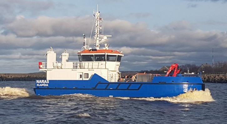 6 Dec 2017 Klaipeda Seaport Authority fleet has increased by one new vessel – the a new built oil response and diving support vessel "Naras" entered the Seaport on the 5th of December 2017. This modern and functional vessel will allow the employees of the Seaport Authority to work more efficiently and will facilitate the implementation of nature protection requirements. "This vessel will allow to perform better and more rapidly the subsea technical works and supervision in Klaipeda Seaport and Port access areas. The vessel is equipped with pressure chamber, providing the possibility for divers to perform safely works in deeper waters (even up to 50 meters). It will perfectly serve as nature protection instrument as well as in the event of an oil spill the vessel can respond to oil spills and collect garbage spread on the water surface. The vessel‘s bow is equipped with crane for removal of bottom obstacles (sunk tires, anchors, chains and other sunk objects)" – the Head of Port Fleet Department Gintaras Petreikis named the advantages of the vessel "Naras". Vessel "Naras" was built in Estonia, in "Baltic Workboats AS" ship building yard. Her length is 23,2 meters and width is 6 metres. Maximum draught is 1,52 metres. The vessel can reach the speed of 11,5 knots. "In order to provide the streamlined Seaport activity we must constantly be ready to assure the necessary depth and to remove the possible obstacles in the Seaport waters‘ territory or alongside the quays, for example boulders that remain after capital dredging works and etc. Therefore we must always be prepared technically. The new vessel will allow us to assure more efficiently navigation safety in the Seaport“, told Director General of Klaipeda State Seaport Authority Arvydas Vaitkus. The price of vessel "Naras" was 2,895 million euros. The single crew of the vessel will be composed of a captain, engineer and a motorman. The team of three divers will be constantly working on the vessel. The name of the vessel "Naras" were selected by the employees of the Seaport Authority.