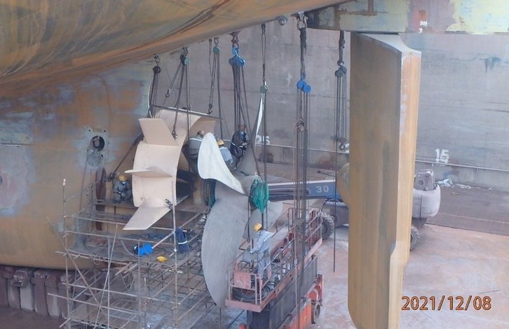 Ongoing installation of Becker-Mewis Duct aboard MV Baffin, currently undergoing 5-year Class renewal dry dock. Image by Klaveness Combination Carriers.