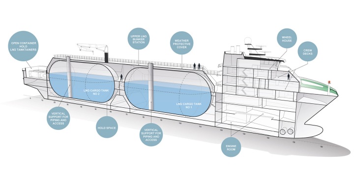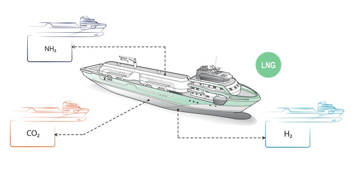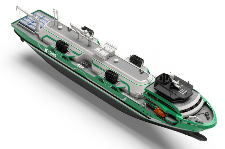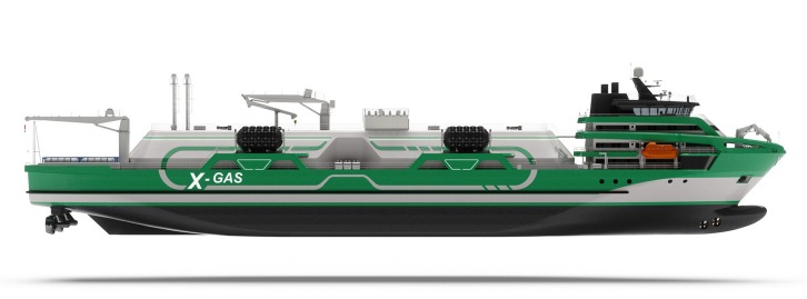 19 April 2021 The X-gas Project is a series of innovative and unconventional, medium-capacity Liquified Gas / Gas bunkering tankers designed by KNUD E. HANSEN. The flagship design of the project is a 126.5 metre vessel with a total cargo capacity of 9,000 cubic metres, split between two Type C tanks. The platform, however, is highly customizable and can be tailored to accommodate a range of tank capacities, as well as various containment systems including membrane tanks. The most unique feature of the X-gas platform is a low-profile, forward deck house. This enables the vessel to safely approach and pull alongside cruise ships with low-hanging lifeboats. This also minimizes the need for ballast during cargo transfer, thereby lowering operational costs. Lastly, the forward deck house allows for larger cargo tanks without impeding bridge visibility. For improved maneuvering and safety, the design features two propulsion thrusters aft and two bow thrusters, as well as an autodocking system for alongside mooring. The design features a novel and extremely fuel-efficient diesel electric power and propulsion plant consisting of one of the most fuel efficient dual-fuel 4-stroke engines available. Integrated with the propulsion plant is an Energy Storage System (ESS) with a lithium-ion battery bank that allows for engine load optimization with reduced methane slip. The batteries also provide all of the power required during cargo transfer, resulting in no emissions or exhaust in way of the ship being bunkered, an especially important feature for passenger vessels. Boil-off gas from the cargo tanks is captured and consumed in the dual-fuel engines and the energy surplus generated can be stored in the batteries. Waste heat from the engine cooling water is converted to electric and thermal power through a number of ORC (Organic Rankine Cycle) waste heat units. As a novel approach, wasted energy captured during operation can be stored in accumulators and released as required to drive absorption chiller and reduce the electrical load onboard. This approach boosts energy efficiency to a very high level. Another unique feature of the design is an aft ‘energy bay’ that allows the vessel to provide containers loaded with fuel or stored electrical power to a receiving vessel. It also allows the vessel to provide fully charged battery banks to remote locations ashore, where current infrastructure does not allow sufficient power to be provided. The principal particulars of the baseline vessel are as follows: Length (overall) 126.5 meters Breadth (moulded) 20.5 meters Design Draught 5.25 meters Service Speed 13 knots Ice Class 1A Deadweight 4,775 tonnes LNG Capacity 9,000 cubic meters Crew Capacity up to 16 Through the X-gas Project, KNUD E. HANSEN has harnessed its vast experience and reputation for designing groundbreaking, energy efficient ships to create a new platform that will support cleaner energy for generations to come. KNUD E. HANSEN is already expanding the X-gas platform to accommodate zero emission fuels such as liquid and compressed hydrogen to meet the growing demand in this sector.