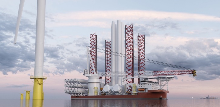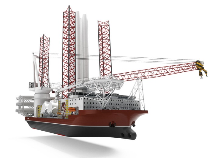 17 June 2021 The latest addition to KNUD E. HANSEN’s Atlas series of wind turbine installation vessels, the Atlas A-class is able to carry four new-generation 14 megawatt wind turbines and is tailored for cost-effective installation of large-scale wind farms. The vessel is specifically dimensioned for transporting and assembling wind turbines on top of pre-installed foundations. This is predicated on the idea that growth in the offshore wind sector creates more opportunities for specialized vessels. The foundations, which are heavy but do not require jacking, can be efficiently installed from a heavy-lift vessel. As a result, the Atlas A-class can be entirely optimized for the jacking operation, with a 1600-2500 tons crane and minimal system weight for the jacking equipment. In keeping with the philosophy of the Atlas series, the A-class design can be highly customized by selecting cranes, thrusters, generators and jacking systems according to the specific requirements of the client, as well as availability from the manufacturers. This offers important competitive advantages over less flexible, off-the-shelf designs. The powering of the vessel is provided by eight generators connected to a DC grid and a battery pack, allowing the engines to run at variable speed for fuel efficiency while also utilizing load leveling and peak shaving. The batteries not only provide instant power, avoiding unnecessary spinning reserve power from the generators, but also make it possible to recover approximately 60% of the energy used for jacking, when the jacking units are reversed on the way down. Furthermore, the high-speed electrical rack-and-pinion jacking system is designed for 5,000 load cycles, ensuring that the legs and components will withstand wear throughout the life of the vessel, avoiding costly and resource-heavy replacements along the way. The main deck of the accommodation block includes an operations center consisting of offices and meeting rooms as well as a hospital, day room, TV room, change room, and workshop. Above this is a large galley with spacious mess as well as ample provision rooms. The three decks above include a total of 114 cabins for contractors, crew and officers. The top deck consists of a bridge with center and wing consoles and a large helicopter deck. Below the main deck is a gymnasium, cinema, TV room, games room, and sauna as well as a laundry room and store rooms. The ATLAS A-Class has been developed completely in-house, by the experienced staff of naval architects, mechanical engineers and designers at KNUD E. HANSEN who place the utmost importance on safety, efficiency and design ingenuity and have been doing so for over 80 years. Main Particulars Length Overall (excluding helideck) 155,40 m Breadth moulded 57,40 m Depth to Main Deck 12,50 m Draught, moulded @ 14,000 t deadweight 6,50 m Speed @ 6.20 m draught incl. 10% s.m. 12 kts
