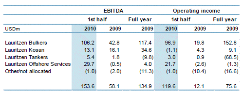 J. Lauritzen A/S (JL) enjoyed a good start to the year and JL’s share of results totaled USD 99.6m for the first six months of the year compared to USD 1.5m for the first half-year in 2009.