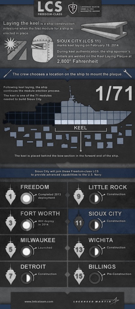 The industry team is building Freedom-class LCSs for the U.S. Navy, and has delivered two ships with five others under construction and one soon to begin construction. The nation’s first LCS, USS Freedom, completed her deployment to Southeast Asia, during which she participated in multiple international maritime exercises, conducted patrols in the South China Sea and provided disaster relief for Operation Damayan. As USS Freedom proved, the ship class is addressing the Navy’s need for an affordable, highly-networked and modular ship unlike any other in the world. The platform is designed and outfitted with mission systems to conduct a variety of missions including anti-surface, mine and submarine warfare. The next LCS to deploy will be the Freedom-class USS Fort Worth (LCS 3) in 2014. “We are proud to provide our Sailors with a proven warship that allows them to carry out their missions around the world,” said Dale P. Bennett, executive vice president of Lockheed Martin’s Mission Systems and Training business. “We are working in partnership with the Navy as they build a fleet able to operate forward, stand ready for any challenges, and serve our essential warfighting requirements.” In keeping with a time-honored tradition, ship sponsor Mrs. Mary Winnefeld authenticated the keel block by having her initials welded. “I'm both honored and delighted to be back in my home state of Wisconsin as the sponsor of the future USS Sioux City,” said Mrs. Winnefeld. “It's been a real privilege to meet the great Americans who are building this versatile ship, and I thank them in advance for their quality work. I look forward to meeting her crew soon, being part of her family, and bringing our ship to life when she's commissioned.” The Lockheed Martin-led LCS team includes ship builder Marinette Marine Corporation, a Fincantieri company, naval architect Gibbs & Cox, as well as nearly 900 suppliers in 43 states, including approximately 30 small businesses in Wisconsin and Michigan. Lay the keel is a shipbuilding term that marks the beginning of the module erection process, which is a significant undertaking that signifies the ship coming to life. Modern warships are now largely built in a series of pre-fabricated, complete hull sections rather than a single keel, so the actual start of the shipbuilding process is now considered to be when the first sheet of steel is cut and is often marked with a ceremonial event. About Lockheed Martin