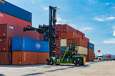 Cargo containers and loader at Port of Long Beach Pier J PCT terminal. Image by Port of Long Beach Port of Long Beach press release