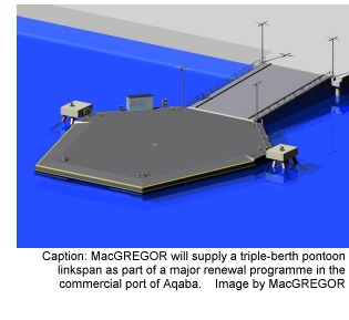 • Aqaba Ports Corporation in Jordan has contracted MacGREGOR to supply a triple-berth pontoon linkspan as part of major renewal of the Red Sea commercial port of Aqaba. The linkspan will be important for the development of RoRo and passenger ferry traffic, mainly from the Egypt Sinai area into Jordan. The facility is due for delivery at the beginning of 2010.