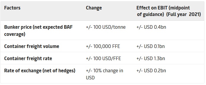 Sensitivity guidance Financial performance of A.P. Moller - Maersk for the full-year 2021 depends on several factors and is subject to uncertainties related to COVID-19, bunker fuel prices and freight rates given the uncertain macroeconomic conditions. All else being equal, the sensitivities for the full year 2021 for four key assumptions are listed in the table below: