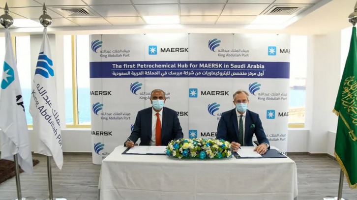 Image by A.P. Moller - Maersk Group. Commenting on the partnership and the agreement to establish Maersk Integrated Logistics Hub, Mr. New, CEO of King Abdullah Port said, “The strategic partnership between Maersk and King Abdullah Port is an important step in raising the efficiency of the Kingdom’s logistics sector and boosting our capabilities in logistics and trade in line with the Vision 2030 objectives. We are delighted to partner with the world’s leading integrated container logistics company to establish the Kingdom’s first petrochemical hub. We are confident that this will significantly enhance the port’s outstanding operational capabilities by enabling us to provide sophisticated services seamlessly, amid the challenges of the current economic situation and the rapid changes in the industry. The hub will also help our exporters to achieve considerable savings in terms of time and costs besides significantly reducing risks, helping them serve international customers better.” Owned by the Ports Development Company, King Abdullah Port is the region’s first port to be owned, developed, and operated by the private sector. Ranked as the world’s second most efficient port by The World Bank in 2020, the port emerged as one of the world’s top 100 ports within four years of operation. With its strategic location in King Abdullah Economic City – a modern city with a pro-business ecosystem and infrastructure – King Abdullah Port leverages the city’s advanced facilities and services, particularly the Industrial Valley, which has attracted many logistics projects as well as light and medium industries. About A.P. Moller – Maersk A.P. Moller - Maersk is an integrated container logistics company working to connect and simplify its customers’ supply chains. As the global leader in shipping services, the company operates in 130 countries and employs roughly 80,000 people. About King Abdullah Port Strategically located on the Red Sea coast in King Abdullah Economic City, King Abdullah Port is the Middle East’s first privately owned, developed, and operated port. Occupying an area of 17.4 km2 and enjoying close proximity to the key Saudi cities of Jeddah, Holy Makkah, Al Madinah, and Yanbu, as well as its direct access to extensive transportation networks that facilitate cargo transport across the Kingdom and the region, the port is making an increasingly important contribution to Saudi Arabia’s growing role in global maritime trade and logistics. Once fully completed, King Abdullah Port will be capable of handling 25 million TEU, 1.5 million CEU, and 15 million tons of clean bulk cargo annually. With state-of-the-art infrastructure and processing facilities, the world’s deepest 18-m berths, and multi-level expanding operations, in addition to a fully-integrated Port Community System, the Smart Gate System and multipurpose bonded and re-export zones, King Abdullah Port reflects the important role of the private sector in realizing Vision 2030. A.P. Moller - Maersk Group, press release