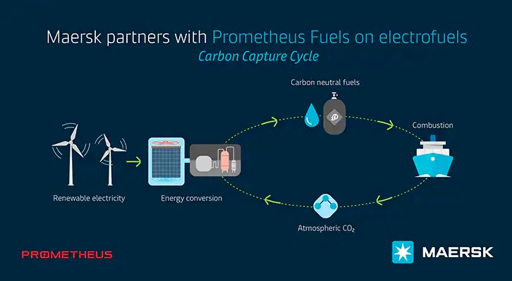 Maersk Growth has made a leading venture investment in Prometheus Fuels, a Silicon Valley-based startup with a promising direct air capture-technology to enable cost efficient, carbon neutral eFuels for shipping. Copenhagen - 23 September 2021 The minority investment in Prometheus Fuels will support A.P. Moller - Maersk’s work to execute on the strategy to decarbonise marine operations. Maersk expects several fuels to exist alongside in the future fuel mix and has identified 4 potential fuel pathways to decarbonization; biodiesel, alcohols, lignin-enhanced alcohols and ammonia. The investment supports Maersk’s efforts with electrofuels which include alcohols produced from renewable energy. Along with biodiesel, alcohols including green methanol are feasible fuel technologies already today. "Prometheus Fuels is developing a very exciting and innovative technology to produce carbon based electrofuels from direct air capture of CO2. Electrofuels are expected to play a key role for the decarbonisation of shipping and, if scaled successfully, Prometheus Fuels’ technology will address a key constraint for carbon based electrofuels – namely the cost competitiveness of direct air capture." Morten Bo Christiansen, Head of Decarbonisation, A.P. Moller - Maersk Maersk expects synthetic alcohols and other electrofuels to play a big role in the decarbonisation of shipping, due to its long-term scalability advantages compared to biobased fuels. Produced from renewable energy and water and ambient CO2 from direct air capture, it has the potential to offer infinite availability regardless of geographic scope. "Our zero net carbon, zero sulphur electrofuel doesn’t compete with food production – it comes from renewable electricity and air so its feedstock is limitless. Our electrofuel offers a truly viable solution to decarbonise shipping – one that can scale and be implemented in time to avoid catastrophic global warming. We’re excited to partner with Maersk, a global leader in decarbonisation in the transportation and shipping industries, to accelerate this transition." Rob McGinnis, Founder and CEO of Prometheus Fuels Maersk joins a team of investors which includes BMW i Ventures and Metaplanet. Peter Votkjaer Jorgensen, Partner at Maersk Growth, will join the Board of Prometheus Fuels. "Decarbonization is a strategic imperative of Maersk, so investing in this space is a natural focus point for Maersk Growth and one where we can offer value beyond capital through the expertise and scale of the Maersk organization. Prometheus’ technology has disruptive potential for the green fuel market, and we look forward to contributing as well as learning from this partnership in the years to come." Peter Votkjaer Jorgensen, Venture Partner in Maersk Growth. In August Maersk ordered 8 Green Methanol fueled ocean-going vessels to be delivered from Q1 2024. Earlier this month Maersk invested in WasteFuel, a California-based startup producing green bio-methanol from waste.
