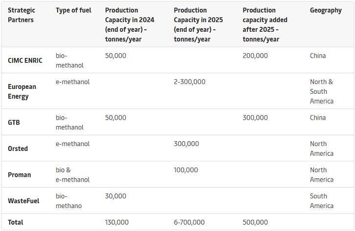 A.P. Moller - Maersk accelerate s fleet decarbonization with 12 large ocean - going vessels to operate on green methanol from 2024. Image by A.P. Moller - Maersk Maersk's green methanol sourcing partners CIMC ENRIC, a subsidiary of CIMC (China) CIMC is a large, industrial conglomerate that has been a partner of Maersk for more than two decades. Its energy division - CIMC ENRIC - is a world leading manufacturer of key equipment and services provider of engineering and system solutions for the clean energy, chemical and liquid food industries. CIMC ENRIC will develop bio-methanol projects for Maersk in China. The phase one project will have a capacity to produce 50,000 tonnes/year of green methanol, starting in 2024. The second phase of the project will have a capacity produce of 200,000 tonnes/year with start date to be determined. The feedstock for the bio-methanol will be agricultural residues. Maersk intends to offtake the full volume produced. Mr. Leo Yang, Executive Director and General Manager of CIMC ENRIC: "CIMC and Maersk have enjoyed close cooperation for the past two decades. We're glad that the two parties have identified another area of collaboration. As a leading intelligent manufacturer in clean energy industry, CIMC ENRIC has rich experience and advanced technology in place. We are always committed to making energy cleaner, the environment more sustainable and to creating a better life. Our partnership on green methanol endeavor will not only support Maersk's journey towards its net zero goal, but also will jointly contribute to a greener and more sustainable future for the shipping industry." European Energy (Denmark) European Energy is a global renewable energy company and project developer (wind, solar and Power to X). It develops, builds, and operates renewable electricity projects globally with a pipeline consisting of 20 GW renewable energy capacity. As a partner, European Energy will produce e-methanol for Maersk's first green feeder vessel, which is expected to be on the water by 2023. They will also develop e-methanol projects in Latin America and the United States that will have a capacity to produce up to 200-300,000 tonnes annually of e-methanol starting in 2025/2026. Maersk intends to offtake the full volume produced on long-term contracts to help its customers realize their own ambitious emission targets. Knud Erik Andersen, Co-founder and CEO of European Energy: " We are very pleased to strengthen our already strong relationship with Maersk with this multi-year partnership where the annual target is to deliver up to 300.000 tons of e-methanol. The shipping industry is a vital part in global efforts to curb carbon emissions, and together with Maersk we are now leading this crucial transition towards running ships 100 percent on renewable energy." Green Technology Bank (China) Green Technology Bank (GTB) was established in 2016 by the Chinese government with the priority task to fulfill the 2030 Agenda for Sustainable Development. The purpose is to strengthen the integration of technology and finance, to accelerate the transformation and industrialization of technological achievements, to drive the realization of 2030 sustainable development goals, and explore for a green development model. GTB will facilitate development of bio-methanol projects in China together with project developers to be identified. The first project is planned to have a capacity to produce 50,000 tonnes/year starting from 2024, and the second project is planned to have a capacity to produce 300,000 tonnes/year at a start date to be determined. Junhao Zhu, President of GTB: " We're pleased to support Maersk's pursuit for green energy to achieve sustainable development. We will collaborate with our partners, integrate technical and financial resources to establish facilities in China to produce green methanol for Maersk. We believe this will also contribute to reduce China's dependence on energy imports such as oil and Liquefied Natural Gas (LNG). The green methanol produced will rely entirely on resources available in China." Orsted (Denmark) Orsted is a global renewable energy company with activities within onshore wind, solar-pv, Power-to-X, and offshore wind, where the company is the world leader. Orsted has a strategic ambition of installing 50 gigawatts of renewable energy capacity by 2030. The company is the only energy company in the world with a science-based net-zero emissions target as validated by the Science Based Targets initiative (SBTi). Orsted aims at becoming a global leader within Power-to-X and currently has a development pipeline of 11 projects across several hard-to-abate sectors. Partnering with Maersk on the company's ambitious decarbonisation journey, Orsted will develop an e-methanol project in the US that will have a capacity to produce 300,000 tonnes/year starting 2025. Maersk intends to offtake the full volume produced. Martin Neubert, Deputy CEO and Chief Commercial Officer at Orsted: "The maritime industry faces a chicken-and-egg challenge, where the supply and demand of green fuels will have to evolve in parallel to fast ensure a sustainable development of zero emission fuels. Orsted is very pleased to partner with A.P. Moller - Maersk to address this challenge by scaling green fuel production together with an industry leader in the maritime sector." Proman (Switzerland) Proman is an integrated energy company and the world's second largest methanol producer. Headquartered in Switzerland, with assets in the United States, Trinidad and Oman, and ongoing expansion into Mexico and Canada, Proman is a global leader in methanol, fertilizer and other products such as melamine. The company is committed to developing sustainable methanol and ammonia as cleaner alternatives to fossil fuels, offering a pathway to drastically cutting emissions in power generation, overland transportation, shipping and industry. Proman will aim to supply Maersk with 100,000 - 150,000 to