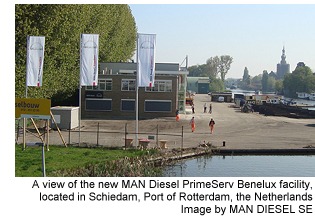 This new location confirms the presence of MAN Diesel PrimeServ in the Port of Rotterdam, one of the world’s busiest ports, and will provide a great boost to our international service hubs.” He concluded: “We are confident in our future, together!”. Service capabilities MAN Diesel PrimeServ Benelux specialises in:. • full, two- and four-stroke engine service: propulsion engines, stationary engines, gensets and propulsion packages. • honing of two- and four-stroke liners. • pneumatic overhaul on board. • repair of fuel-injection equipment. • overhaul and installation of Alpha lubricator systems. • engine performance check. • turbocharger overhaul and repair. • new and reconditioned spare parts. The new facility at Schiedam contains very specialised workshops with a broad range of facilities including: . • a workshop for the overhaul of medium and large engine components. • a fuel-repair shop. • an electronic and pneumatic workshop. • a dedicated turbocharger workshop. PrimeServ Benelux can take advantage of a broad range of special equipment and tools, including: . • honing devices. • pressure-testing devices. • grinding devices. • a climate room for the fuel shop. • a cleaning bay that complies with the latest environmental standards. • ultrasonic cleaning machines. • balancing machines for large and small turbocharger rotors. • endoscopes. MAN Diesel SE, Press Release |
