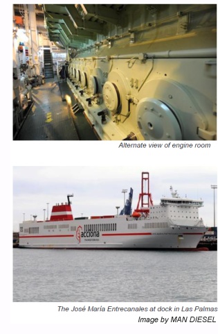 The José María Entrecanales is powered by four nine-cylinder MAN 48/60B main engines, each delivering 10,800 kW at 500 rpm. This configuration is widely used in tankers, cruise liners and container ships as the successful 48/60 series is well-known for its excellent performance and flexibility.The 48/60 series has been redesigned recently with a focus on further improving performance. Primarily, this concerns the cylinder head where a higher-pressure injection results in improved atomisation and better combustion, ultimately reducing both fuel consumption and emission levels. The cylinder head also contains a system for automatically adjusting injection timing (VIT) to minimise NOx emissions. The TCA axial-flow turbocharger that MAN Diesel & Turbo initially introduced to the market in 2001 also plays a vital role in the success of the 48/60B engine and the José María Entrecanales has integrated the TCA66 model into its propulsion system. The turbocharger's components have been optimised with regard to flow control and stress reduction through 3D-modelling, CFD and FEM calculations, resulting in highly resistant turbine blades. In addition, the removal of the turbocharger's damping wire has also improved efficiency and facilitates maintenance. Another new design feature is the incorporation of high-performance thrust bearings and floating bushes to minimise mechanical losses and improve turbine performance. Furthermore, inspection of the thrust bearing no longer requires removal of the shaft. Auxiliary engines The new ro-ro cargo vessel features three eight-cylinder, auxiliary MAN L21/31 engines, delivering 1,935 kW per engine at 1,000 rpm and characterised by a pipe-less design that includes: • a front-end box housing cooling-water pumps, thermostatic valves, fuel-oil and lube-oil pumps, a lube-oil cooler and a lubricating-oil filter • a cylinder-unit concept including cylinder heads, liners, pistons, connecting rods and fuel-injection valves. This enables the swapping in of a spare cylinder unit aboard, dispensing with the need to break voyages to return to the workshop in the event of breakdown The José María Entrecanales The new ship's keel was laid down in June 2007 and it was first floated in March 2009. Final delivery took place on 18 March, 2010. The José María Entrecanales is now operating on the Barcelona – Alicante - Las Palmas de Gran Canaria (Canary Islands) - Santa Cruz de Tenerife – Agadir (Morocco) – Barcelona route. As such, Acciona Transmediterránea's large investment in the ship reflects the need for a design able to cope with the demanding nature of a route that requires a significant cruising speed to complete the weekly round-trip of 1,500 nautical miles. Acciona Transmediterránea has done business with MAN Diesel Spain on several occasions in the past, and has now chosen MAN technology again for the latest additions to its fleet. MAN Diesel SE, Press Release |
