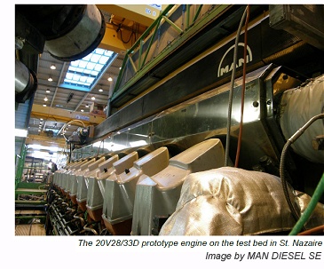 MAN Diesel & Turbo’s first upgraded, twenty-cylinder 28/33D prototype engine recently passed a series of tests on the test bed at the company’s St. Nazaire, France works, and was awarded type approval by Det Norske Veritas (DNV) classification society.