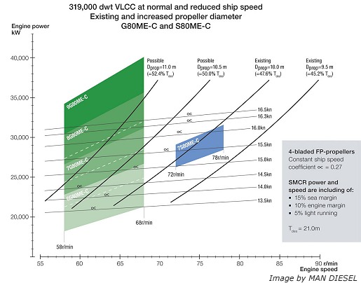 Larger container vessels, in recent years, have also been specified with S80ME-C9 and S90ME-C8 engines because of the opportunity they offer to employ larger propeller diameters. Following efficiency optimisation trends in the market, MAN Diesel & Turbo has also thoroughly evaluated the possibility of using even larger propellers and thereby engines with even lower speeds for the propulsion of tankers and bulk carriers.