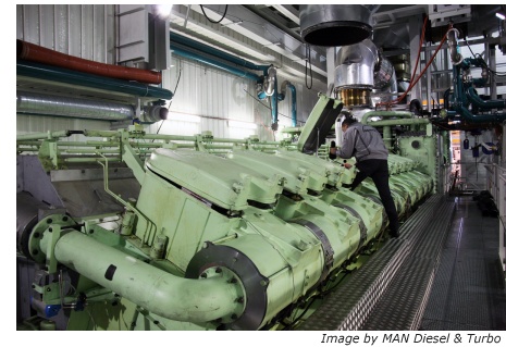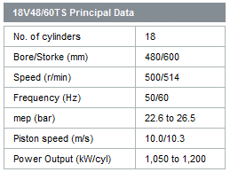 Since its launch in 1988, MAN Diesel & Turbo has sold nearly 800 × 48/60 units, bound for a broad range of power-generation and marine-propulsion applications. Thanks to its high efficiency, the 18-cylinder variant is the 48/60 engine family’s bestselling configuration. The overall design of the two-stage turbocharged 18V48/60TS has been kept as simple as possible and differs in the form of just a few modifications from the standard engine. These include: • modified fuel-injection nozzles for the higher power-output range • a three-ring piston with higher compression ratio • a modified camshaft for enhanced Miller timing • an additional exhaust-gas bypass valve to avoid smoke during start-up. The high-pressure turbocharger is directly mounted to the engine with the lowpressure turbocharger located upstream on its own steel frame. The combustion-air and exhaust-gas piping between both turbochargers is fitted with compensators, ensuring complete insulation from vibrations. Lowest fuel-oil consumption or NOx emissions The excess combustion air from the turbochargers provides greater operational flexibility. The high charge-air pressure can be used for enhanced Miller Cycling, delivering significant fuel savings. Alternatively, it can be leveraged to significantly increase engine power-output while, simultaneously, further reducing NOx emissions. At the power output of 1,050 kW/cylinder, the 18V48/60TS diesel engine has a very low specific fuel-oil consumption of 171.1 g/kWh, referenced to engine power output without engine-mounted pumps, at ISO 3046 conditions with a tolerance of 5%. This is equivalent to a heat rate of 7,305 kJ/kWh or a pure engine efficiency of 49.2%. Referenced to an electrical genset power-output, assuming a generator efficiency of 97.5% and with engine-mounted pumps, the heat rate emerges as 7,607 kJ/kWh or 47.3% electrical genset efficiency. This is an efficiency rate for four-stroke diesel engines, which makes the two-stage turbocharged 18V48/60TS one of the most costeffective diesel engine in its class. The excess combustion air can alternatively be leveraged to significantly increase the engine’s power output up to 1,200 kW/cylinder. Although this does not save fuel, it does allow for a greater reduction of NOx emissions within a wide operation range. NOx emissions of 1,480 mg/Nm³ make the 18V48/60TS one of the cleanest diesel engine in its power range. Flexibility Like the standard engines in the 48/60 series, the two-stage-turbocharged 18V48/60TS can be operated with a wide range of different fuels, including: • heavy fuel oils with a viscosity up to 700 cst • marine diesel and gas oil. Two-stage turbocharging enables the 18V48/60TS to operate continuously at shaft power outputs from 18,900 up to 21,600 kW. In a stationary-power scenario, for example, this would allow power providers to operate engines at a normal load of 18,900 kW, taking advantage of the extremely low fuel-oil consumption and allowing the possibility of a spinning reserve up to 21,600 kW. Two-stage turbocharging technology The advanced technology offered by two-stage turbocharging enables the 48/60TS to reach the highest possible performance in the market. The new engine’s design arranges two turbochargers in series, allowing very high combustion/air-pressure ratios that open up a whole new dimension of operational possibilities. The 18V48/60TS deploys MAN Diesel & Turbo’s tried and tested TCA88 and TCA77 standard turbochargers in sequence. The TCA88 is located upstream and provides the low-pressure turbocharger, while the TCA77 forms the high-pressure turbocharger, next to the engine. In this configuration, both turbochargers can achieve pressure ratios in the range of 6 bar at significantly higher efficiencies compared to a single-stage turbocharged system. Despite the two-stage turbocharger modular system being an engine add-on, the 48/60TS does not require any more space than an engine with a single-stage turbocharger system. The engine features an uncomplicated design where all components are easily accessible for maintenance despite the compact design.