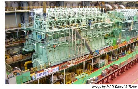 Physically the largest two-stroke engine ever designed by MAN Diesel & Turbo, the engine will deliver a massive torque of 8.5 million Nm at 84 rpm and has a total output of 69,720 kW. The engine has been built by one of world’s major two-stroke engine builders, Hyundai Heavy Industries, and it will be installed on a container vessel built at Samsung Heavy Industries for Orient Overseas Container Line (OOCL), a Hong Kong-based container shipping company well recognised for focusing on sustainable and environmental friendly technology advancements.