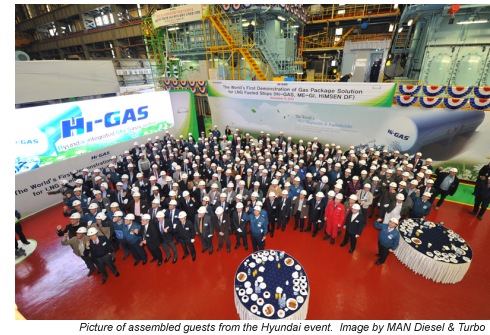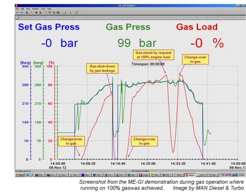 Hyundai’s full-scale demonstration of the ME-GI principle is based on the temporary conversion to ME-GI of an existing production engine – an MAN B&W 8S70ME-C type – generously placed at its disposal by Frontline, the prominent Norwegian shipowner. MAN Diesel & Turbo reports the demonstrations as stemming from customer requests to employ the ME-GI engine in new projects and states that production capability for the ME-GI is already available. The ME-GI engine Unveiled at a major event at MAN Diesel & Turbo’s Copenhagen Diesel Research Centre in May 2011, the ME-GI engine represents the culmination of many years’ work that began in the 1990s with the company’s prototype MC-GI dual-fuel engine. The first two-stroke GI engine, a 12K80MC-GI-S, entered service at a power plant in Chiba, near Tokyo, Japan in 1994. Mitsui reported adopting twin ME-GI engines as prime movers aboard its concept LNG carrier ‘Double Eco MAX’ in July 2011, a move intended to realise a 30% reduction in fuel costs and CO2 emissions. Similarly, major yards in Korea, Japan and China have, or currently are, developing such concepts. Depending on relative price and availability, as well as environmental considerations, the ME-GI engine gives shipowners and operators the option of using either HFO or gas – predominantly natural gas but also, eventually, LPG. MAN Diesel & Turbo sees significant opportunities arising for gas-fuelled tonnage as fuel prices rise and modern exhaust-emission limits tighten. Indeed, previous research indicates that the ME-GI engine delivers significant reductions in CO2, NOx and SOx emissions. MAN Diesel & Turbo predicts a broad, potential market for its ME-GI engine, extending from LNG and LPG carriers to other oceangoing vessel segments such as containerships as well as ships plying a fixed trade. As such, the ME-GI engine represents a highly efficient, flexible, propulsion-plant solution. Technical presentation findings The ME-GI Concept features dual-fuel operation modes with: • no knocking • no unintentional gas injection • no escape of gas to crankcase or engine room • no methane slip. Benefits to the owner include: • full power & performance • full load response • nbsp;full fuel flexibility (Tier II/Tier III) • gas quality flexibility • port-to-port gas-mode operation • fully integrated control system. Origins MAN Diesel & Turbo’s MC/ME engine family has been on the market since 1982 and seen service in almost every type of marine application on container vessels, tankers of all sizes, bulk carriers, car carriers, RoRo and general cargo vessels. As such, the MC/ME engine is a well-proven product in the industry while the GI (Gas Injection) solution was developed in parallel and finished for testing in the early 1990s. Technically, there is very little difference between fuel-oil and gas-burning engines, but the GI engine provides an optimal fuel flexibility. Conclusions The technical presentation’s main points, as revealed at the Hyundai event, can be summed up as thus: • ME-GI concept re-confirmed • layout of S70ME-GI verified • safety procedures verified • performance and efficiency increased • low emissions maintained • ME-GI engine manufacturing confirmed • test facilities available • ME-GI is ready for orders • pertaining auxiliary equipment readily available. MAN Diesel & Turbo, Press Release |