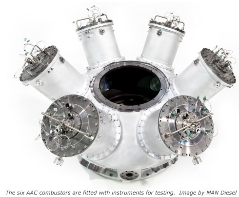 MAN Diesel & Turbo has already developed and successfully implemented an "Advanced Can Combustor" (ACC) for their time-proven THM gas turbine family. These can-type combustion chambers work on the principle of premix technology. The fuel is already premixed homogeneously with the combustion air before entering the combustion chamber. The result: Fuel-rich hot strands are avoided. This means that significantly less nitrogen oxides, which are harmful to both living beings and plants at higher concentrations, are formed in the exhaust gas.