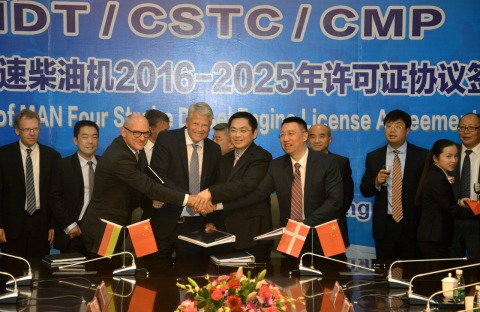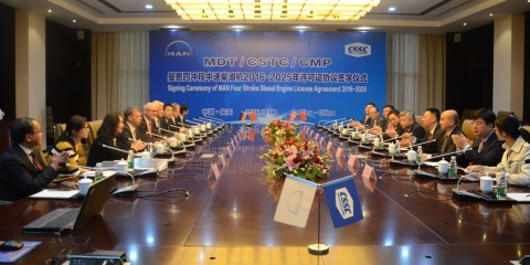 The summit included top management executives from CSSC and MAN Diesel & Turbo. 2015-10-15 Marine Medium Speed At a signing ceremony in Anqing, Anhui province on 8 October 2015, CSSC Marine Power Co., Ltd. (CMP) renewed its contract with MAN Diesel & Turbo for another 10 years of production of four-stroke medium speed engines. CMP is an engine-manufacturing division of the Chinese State Shipbuilding Corporation (CSSC), one of the largest Chinese shipbuilders. The new agreement marks the renewal and continuation of a cooperation that first started in the 1980s. Mr. Zhang Haisen, Chairman of CSSC Marine Power Co., Ltd. - said: “The extension of the four-stroke licence agreement between CMP and MAN Diesel & Turbo is a tribute to the very first licence we bonded 35 years ago. Furthermore, the comprehensive cooperation scope refers not only to four-stroke diesel engines, but also to two-stroke low speed engines, CPP propellers, turbochargers, and SCR systems. CSSC values MAN Diesel & Turbo as its premium partner, and sincerely expects to continue this important business partnership to another 35-year milestone.” Klaus Engberg – Senior Vice President and Head of Two-Stroke Licensing –said: "We have enjoyed a long, close cooperation with CSSC/CMP that stretches all the way back to 1980, and over the years CMP has produced a broad range of MAN four-stroke engines, but also small two-stroke engines.” Engberg continued: "Especially over the last decade, our two companies have intensified their technical cooperation, making CMP today one of MAN Diesel & Turbo’s major licensees globally for such engines, and the largest producer of MAN four-stroke engines in China.” Ulrich Vögtle – Vice President and Head of Large Bore Four-Stroke Licensing – said: "We view our relationship with CSSC as pivotal to our success in giving Chinese customers access to our technology. Accordingly, we are very happy and proud today to be able to officially announce the continuation of our excellent business relationship for the next decade." To date, CMP has delivered 5,000 units of MAN four-stroke diesel engines, equivalent to 4,700,000 kW. CMP also holds a licence agreement for two-stroke MAN B&W engines, which it too renewed for a decade at a ceremony in Beijing earlier this year. About CSSC/CMP Headquartered in Beijing, CSSC handles shipbuilding activities in the east and south of China and consists of various ship yards, equipment manufacturers, research institutes and shipbuilding-related companies. Some of the best-known shipbuilders in China, such as Jiangnan Shipyard and Hudong-Zhonghua Shipbuilding, are currently owned by CSSC. Zhenjiang Marine Diesel (ZJMD), CMP’s predecessor, was founded in 1976 and signed a 15-year medium-speed licensing agreement with MAN Diesel & Turbo on 13 May 1980. This was subsequently extended in 1995 and 2005. MAN Diesel & Turbo, Press Release |