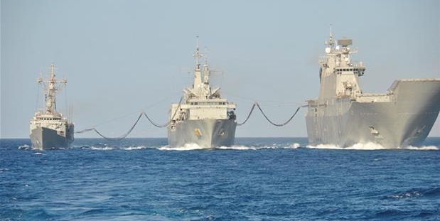 The RAN’s new fleet support tankers are based on the Spanish Navy’s ‘SPS Cantabria’, commissioned in 2010. In the picture, the Cantabria (centre) is simultaneously refuelling a minor vessel and (right) the ‘Juan Carlos I’, the Spanish Navy’s multi-purpose amphibious assault ship and largest vessel (courtesy Navantia). Image by MAN Diesel & Turbo. MAN Diesel & Turbo, Press Release |