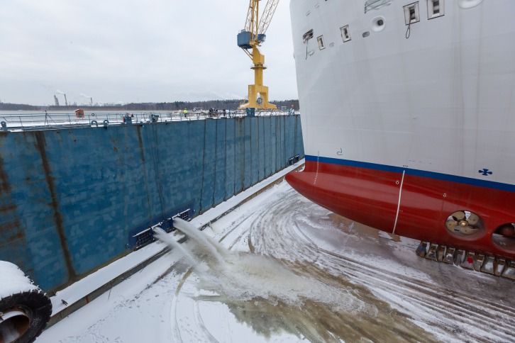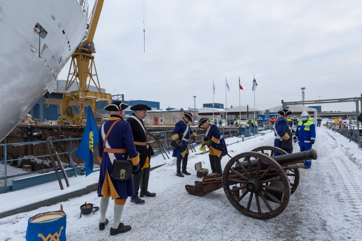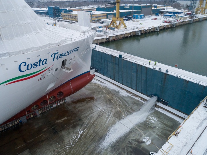 Turku, Finland - 15.1.2021 The LNG powered, 185 000 GT, cruise ship Costa Toscana was floated out to the outfitting pier at Meyer Turku shipyard today. Due to hard weather conditions, the actual filling of the dry dock started already yesterday. "The float-out is always a very special occasion for us shipbuilders, as the ship is finally set to her natural environment. As this is also the start of the final stage of shipbuilding, all the exciting colors, venues and features will start taking their final form. In the coming months she will be finalized at the pier and then tested and commissioned in the autumn for delivery", CEO of Meyer Turku, Tim Meyer, says. As can already been seen from her outline, Costa Toscana will be a very beautiful ship. CEO Tim Meyer feels confident that passengers will greatly enjoy cruising onboard: "On the start of the year and on this special occasion I want to look forward: I believe Costa Toscana will enter service in a world where passengers will once again be able to fully enjoy the wonders of the seas and the ship on a cruise holiday." "Looking beyond the pandemic, we are focusing on to complete the transformation of our fleet and operations into a sustainable model. In addition to LNG technology, we are developing other innovative solutions, such as shore power and batteries, as we continue to work towards achieving zero emissions over time", Chief Commercial Officer of Costa Cruises Mario Zanetti explains. Costa Toscana is a sister ship to Costa Smeralda, delivered from Turku in 2019. As befits her name, she will present to the guests the best of Italy's famous region with delicacies, food, wine and relaxed living. Adam D. Tihany has curated the design of the interior, as with Costa Smeralda. Costa Toscana is powered by liquefied natural gas (LNG) and has been designed with a circular economy concept. The use of LNG will eliminate all sulfur dioxide emissions and almost all particular matter emissions (95-100% reduction), while also significantly lowering emissions of nitrogen oxides (direct reduction of 85%) and CO 2 (up to 20%). The ship also has an intelligent energy efficiency system, and 100 % of the ship's recycling materials (such as plastic, paper, glass and aluminum) will be carried out of the ship and recycled.