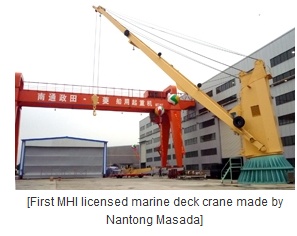 Nantong Masada Ship Machinery was jointly established in 2005 by Nantong Universal Machinery Co., Ltd., an industrial machinery manufacturer in Jiangsu, and Masada Ironworks Co., Ltd., a winch manufacturer in Osaka, Japan, to produce marine deck equipment. MHI licensed its deck crane technology to Nantong Masada in June 2008, following which a 30,000 square meter plant dedicated to deck crane manufacture was built with MHI's guidance. Production got under way at the plant in June 2009.