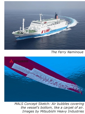 Mitsubishi Heavy Industries, Ltd. (MHI) has installed its innovative "Mitsubishi Air Lubrication System" (MALS) for the first time on a ferry - a ship with a slender hull form* - and confirmed over 5% improvement in fuel consumption. MALS is MHI's proprietary technology that reduces frictional resistance between the ship hull and seawater by introducing a layer of air bubbles blown from the ship's bottom. The verification experiment was conducted at sea using the FERRY NAMINOUE, a ship owned by Japan's A-LINE Ferry Co., Ltd. that went into service starting September 27. The experiment results have verified that MALS is also applicable to high-speed, slender ships as an effective way to reduce fuel consumption and reduce environmental burdens, further extending the range of ship types for which MALS is suited.